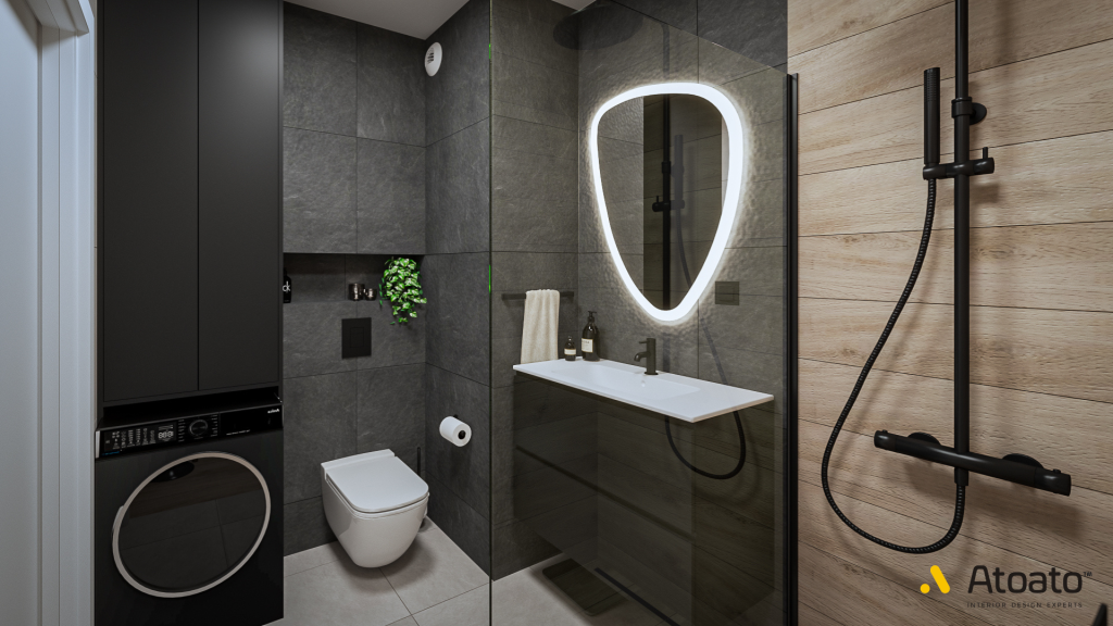 W łazience postawiliśmy na połączenie trzech rodzajów płytek: drewnopodobnych, jasnoszarych oraz grafitowych. Drewnopodobne płytki wydzielają strefę prysznica walk-in, co wprowadza ciepło do przestrzeni. Nad zabudową geberitu zaprojektowaliśmy wnękową półkę, która została wykończona tymi samymi płytkami, co reszta łazienki. Lustro z podświetleniem dodaje nowoczesnego charakteru, a jego funkcjonalny włącznik w tafli ułatwia użytkowanie.