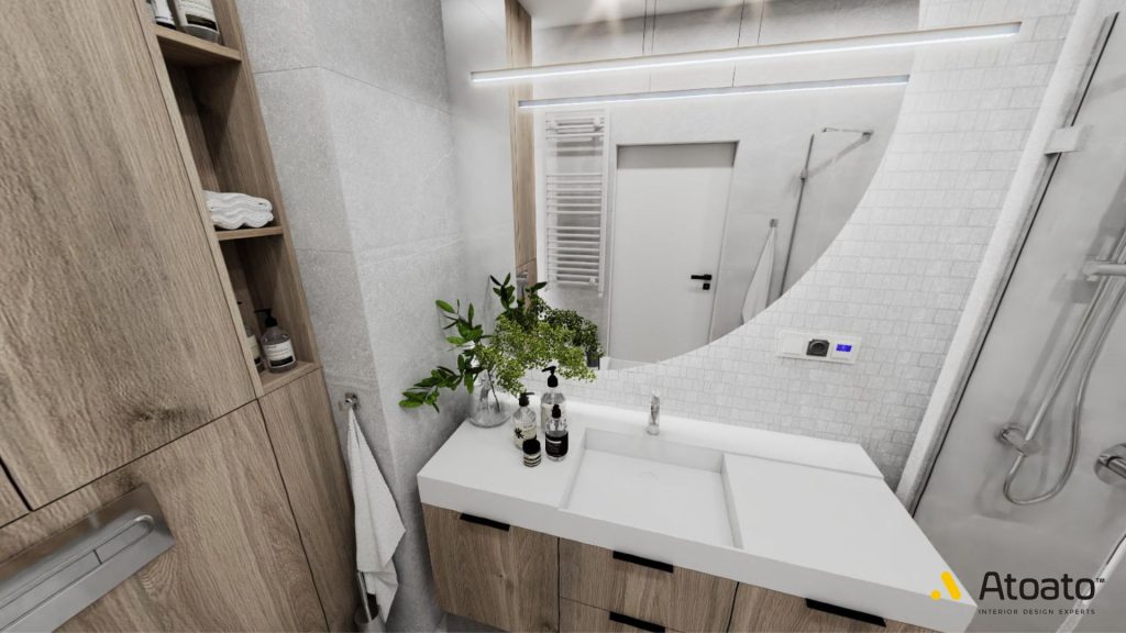 W łazience każdy detal został zaplanowany. Meble wykonane na zamówienie pozwoliły stworzyć przestrzeń idealnie dopasowaną do potrzeb mieszkańców. Szafka pod umywalką skrywa wysuwany kosz na pranie oraz szuflady. Oświetlenie LED nad lustrem, pod lustrem oraz w wnękach prysznica dodaje wnętrzu charakteru i praktyczności. A półki w prysznicu – wykonane z płytek – to połączenie estetyki i wygody.