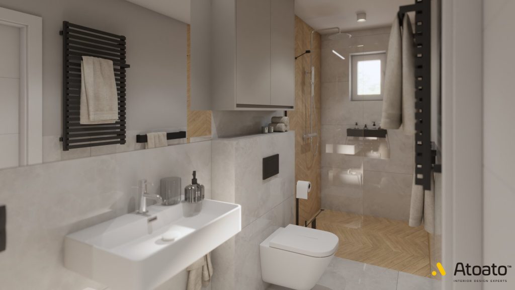 Łazienka na parterze została zaprojektowana z myślą o prostocie i funkcjonalności. Na podłodze i częściowo na ścianach zaproponowaliśmy płytki takie same jak w przedsionku i korytarzu. Nad zabudową geberitu umieściliśmy wiszącą szafkę do kompletu. Strefa prysznica wykończona jest płytkami drewnopodobnymi, a ściany powyżej płytek są pomalowane na jasny szary kolor.