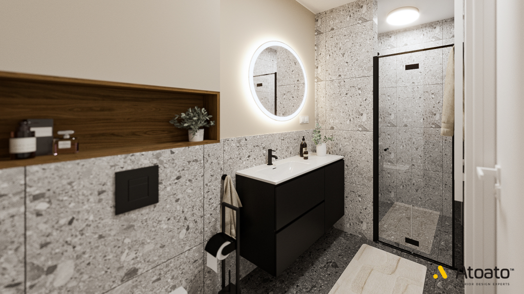 Łazienka, podobnie jak toaleta, korzysta z elementów lastryko, jednak tym razem zdecydowaliśmy się na różne odcienie tych płytek, co nadaje przestrzeni głębi i dynamiki. Zabudowa pralki została zaprojektowana z płyty Egger H3154 Dąb Charleston, co nadaje wnętrzu przytulności i spójności z resztą mieszkania. Warto zwrócić uwagę na przemyślane rozwiązania techniczne – pralka, mimo że wysunięta, została sprytnie ukryta w zabudowie.