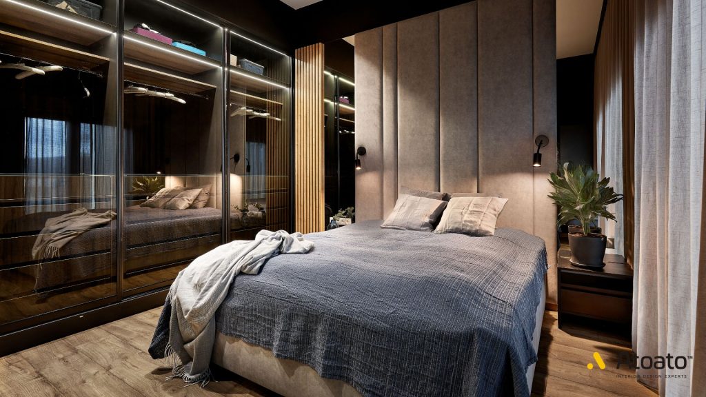 Wnętrze garderoby zostało wyposażone w podświetlane półki i drążki włączane na ruch, co łączy wygodę z nowoczesnym designem. Czarne, minimalistyczne kinkiety po obu stronach łóżka tworzą nastrojowe światło do wieczornego czytania, a ciężkie zasłony gwarantują idealne zaciemnienie. To przykład, że projekt wnętrz w stylu loftowym może być zarówno surowy, jak i pełen ciepła.