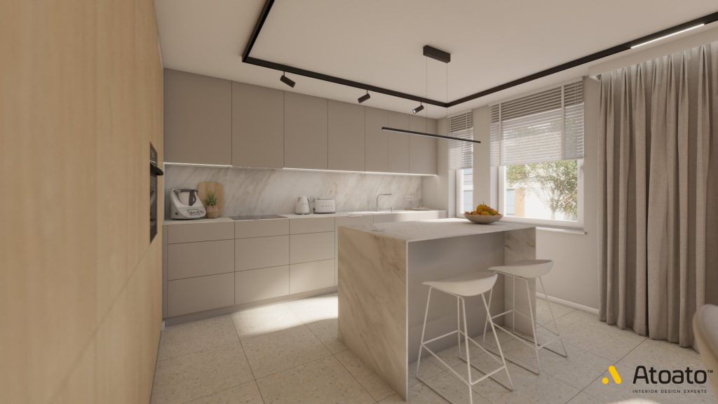 Kuchnia jest miejscem, gdzie spędzamy dużo czasu, dlatego zaprojektowaliśmy ją z myślą o maksymalnej funkcjonalności. Beżowe fronty szafek, laminowane blaty oraz półki na ekspres do kawy sprawiają, że przestrzeń jest jasna i przyjazna. Wysoka wyspa z dwoma hokerami staje się naturalnym miejscem spotkań, a dodatkowe gniazda zasilania pozwalają na wygodne korzystanie z wszystkich sprzętów.