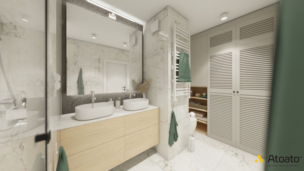 Łazienka połączona z WC została podzielona na trzy strefy, które zapewniają komfort użytkowania każdemu domownikowi. Pierwsza strefa to zabudowa pralko-suszarki, w której znalazło się miejsce na kosze na pranie – wszystko dyskretnie ukryte za ażurowymi frontami lakierowanymi na beżowy kolor, co zapewnia odpowiednią wentylację i estetykę. Druga strefa obejmuje dwie umywalki na szafce, a duże lustro z oświetleniem LED, zainstalowane od góry i dołu, wprowadza przyjemną atmosferę i optycznie powiększa przestrzeń. Jasne płytki w połączeniu z ciemnymi tworzą elegancki kontrast. Trzecia strefa to miejsce na relaks – połączenie wanny i prysznica. Aby zachować wentylację i zapewnić komfort, zdecydowaliśmy się na klasyczne drzwi prysznicowe. Takie rozwiązanie pozwala na swobodne korzystanie z obu funkcji, wprowadzając jednocześnie spójny wygląd całej łazienki. Każda ze stref jest przemyślana, by zapewnić maksymalną funkcjonalność, a jednocześnie cieszyć oko elegancją i nowoczesnym stylem.