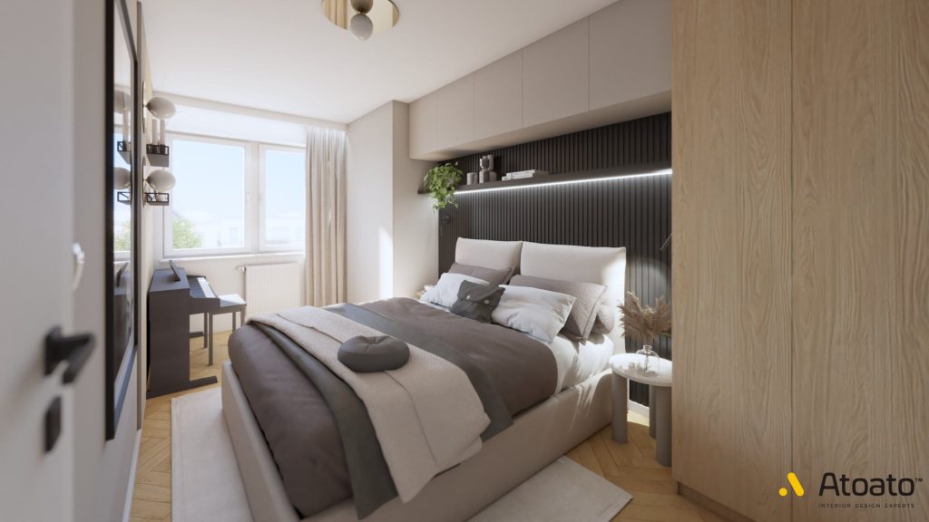 Sypialnia jest miejscem, gdzie wyciszamy się po długim dniu. Dlatego zaprojektowaliśmy ją w jasnych barwach, dodając szafy po obu stronach łóżka oraz zabudowę nad nim. Oświetlenie LED pod sufitem i półką nad łóżkiem tworzy przytulny klimat, idealny do relaksu. Miejsce na pianino zostało przemyślane tak, by wykorzystać dostępną przestrzeń bez jej przeładowania.